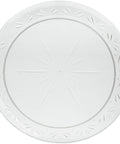 Round clear scroll design plates that are approximately 25cm in diameter.