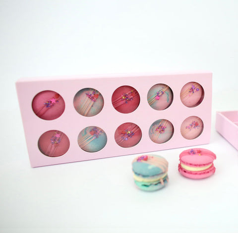 OLBAA Macaron Boxes are easy to assemble and incredibly sturdy with a compartment for each macaron and a beautiful gloss finish. Macaron compartment size is 5cm x 5cm x 3.5cm. The sleeve closure also enhances the protection of your delicate sweets. Elevate your macaron packaging with the OLBAA Macaron Box, designed to offer a premium and elegant solution for showcasing and transporting delicate pastries. Made from high-quality, durable food-grade paperboard, these boxes provide a secure and stylish way to present macarons, cookies, chocolates, and other small baked goods. Each box is crafted to hold 2, 5, or 10 macarons, giving you flexible storage options for different occasions. Whether you're a professional baker, a small business owner, or a home baking enthusiast, these boxes will enhance your presentation while keeping your confections fresh and protected.