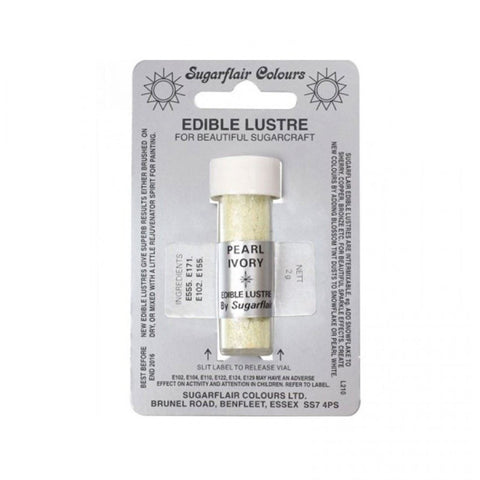 Pearl Ivory Edible Lustre Dust A fabulous silver white shimmering fine powder that will give your sugarcraft creations extra dimension, sparkle and glitz. Can also be used on chocolate and fruit. Apply either dry or with a little rejuvenator spirit for paint